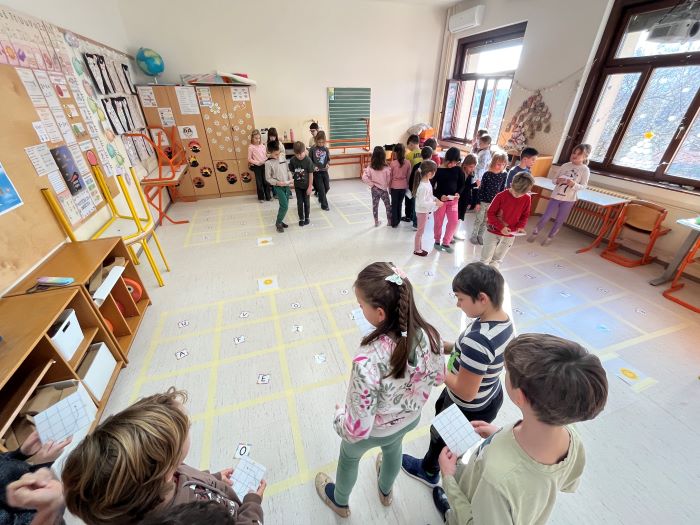 Prvi dve dejavnosti sta potekali na veliki talni mreži. Učenci so bili razdeljeni v skupine po štiri.