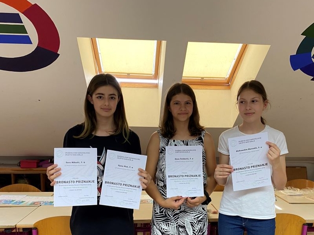 Bronasta priznanja: Aleksandra Marentič, Maša Žnidaršič, Tjaša Plut in Sara Miketič iz 7. razreda, Ana Pustavrh, Lina Franko, Loti Kovačevič, Jakob Kambič, Zala Bukovec, Zala Kambič iz 2. razreda, Gloria Dimovska, Neža Malnarič in Sara Žnidaršič iz 5. razreda.