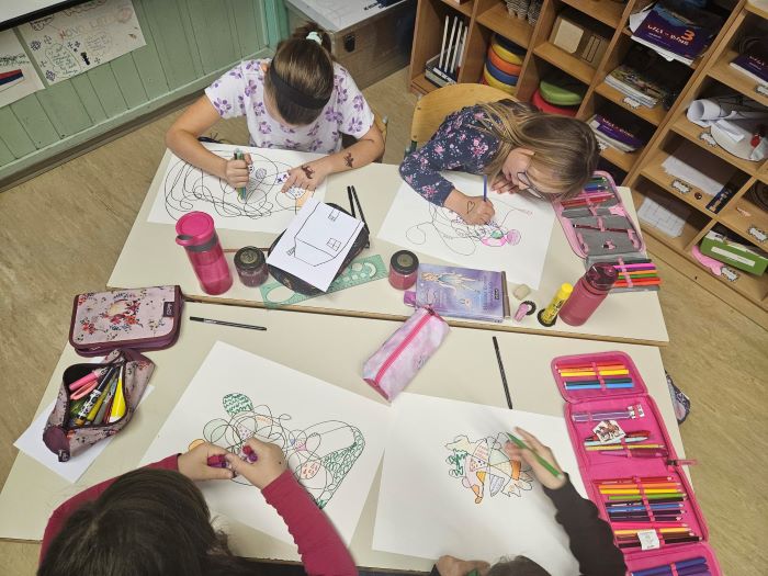 Posebno pozornost smo namenili tudi fraktalni risbi kot načinu izražanja čustev. Učenci so ustvarjali čudovite in izrazne risbe, ki so odražale njihova notranja doživetja in občutke. Tehniko fraktalne risbe nam je predstavila Martina Simonič.