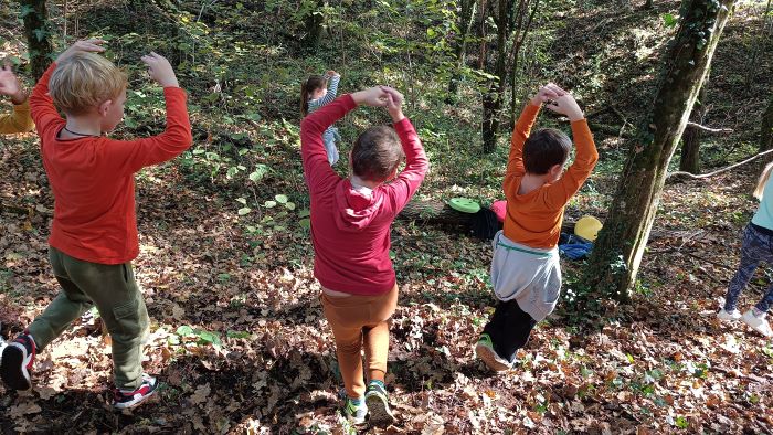 Tretješolci so izdelali avtoportrete iz naravnih materialov, iskali geometrijske oblike in simbole ter izdelali potovalno palico. Iskali so gozdna znamenja in izvajali gibalno nalogo »Gozdni gibalčki«. Oponašali so gibanje živali iz pesmi in prenašali gibalni izraz v zvok, ki so ga ustvarili z naravnim materialom. Sestavili so slikovni zapis pesmi in melodije z materialom, ki so ga našli v gozdu.