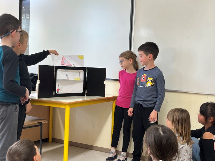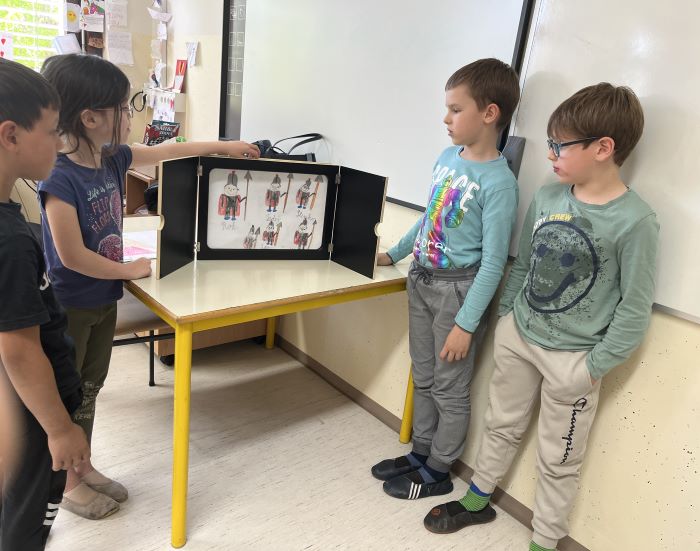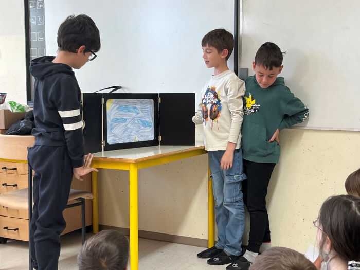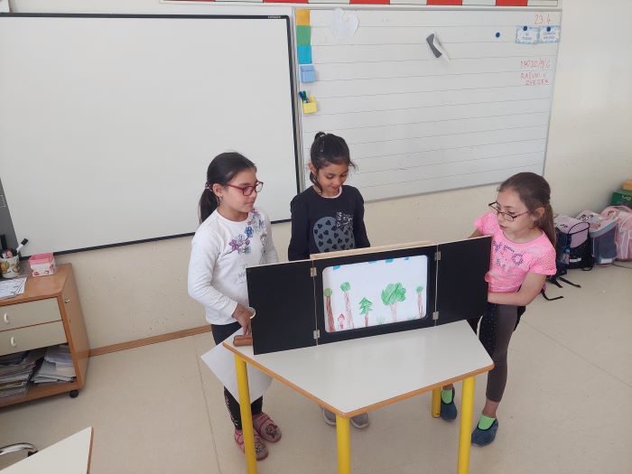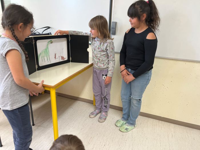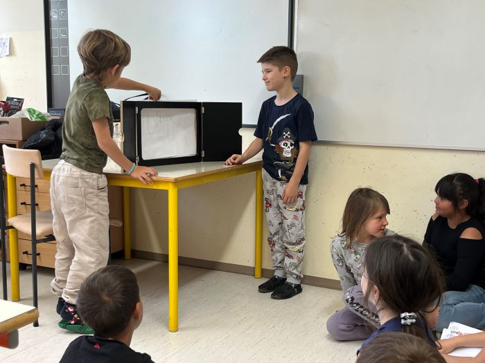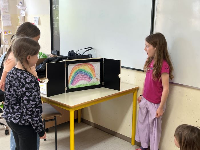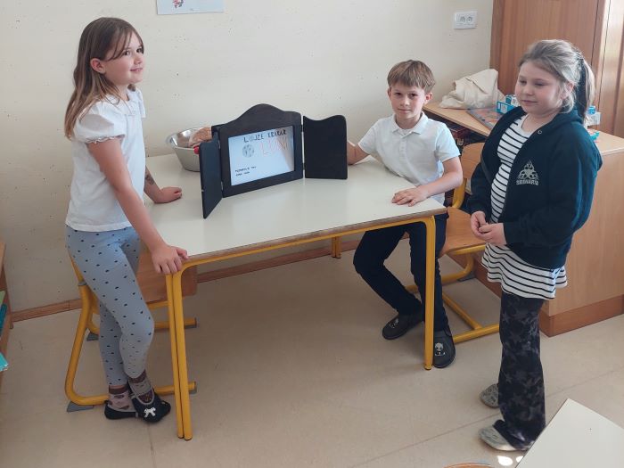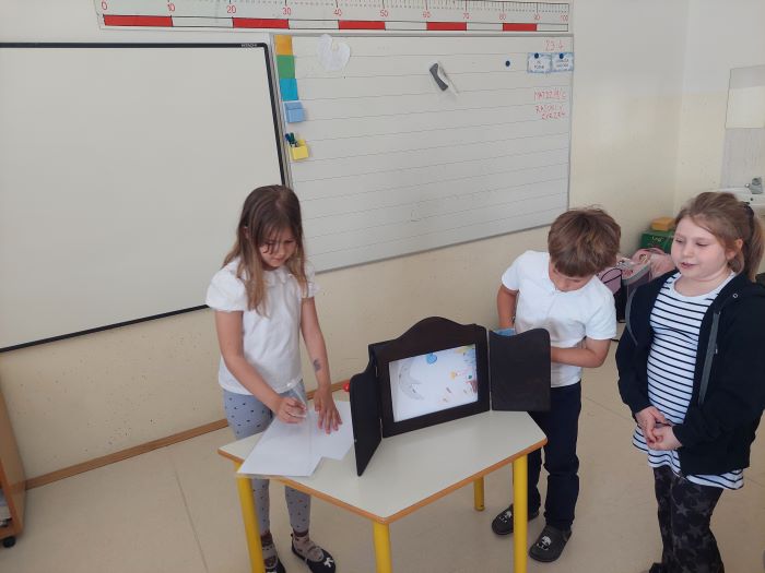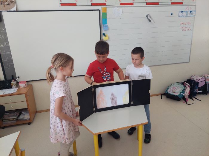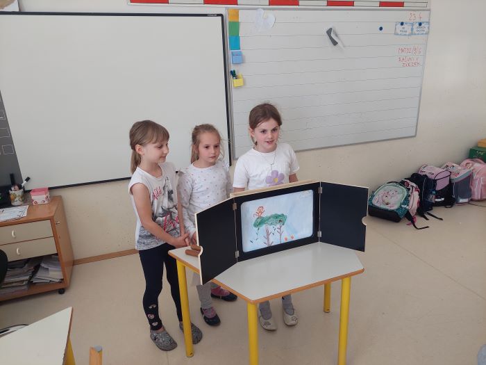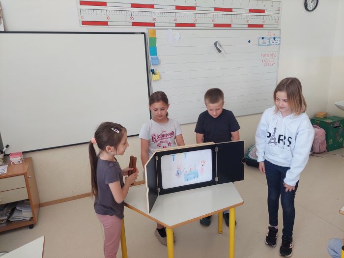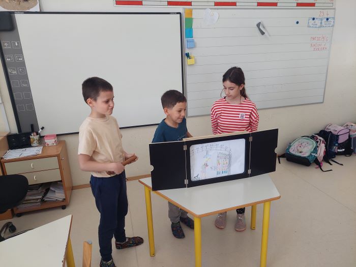 Spoznali so japonsko umetnost pripovedovanja zgodb, to je kamišibaj, ki združuje slikovne podobe in živo pripoved. Učenci niso bili le poslušalci, temveč so se tudi sami preizkusili v vlogi ustvarjalcev in pripovedovalcev. V skupinah so izbrali zgodbe, izdelali slikovne prikaze ter svoje kamišibaj predstave z veliko navdušenja predstavili sošolcem. Ob tem so razvijali domišljijo, sodelovanje, pripovedovalske spretnosti in samozavest.