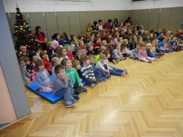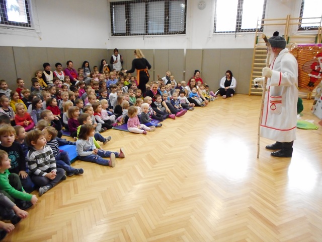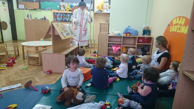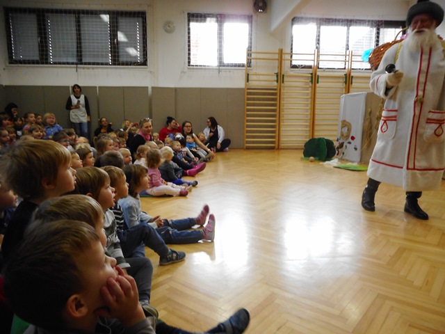 Potem pa so ga otroci glasno poklicali in prišel je s polnim košem daril. Zapeli so mu pesmice in z veseljem je obdaril otroke.